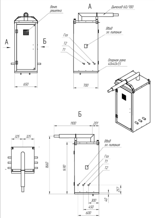 6. Модуль котла: корпус выполнен из оцинкованных листов 1,2 мм, порошковая покраска, утепленный кашированной минеральной ватой 50мм. Нагревательный элемент в комплекте поставки срабатывает при температуре +5°C и автоматически отключается при выходе на рабочую температуру.